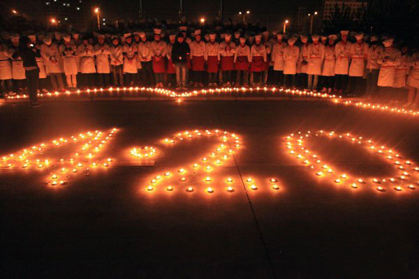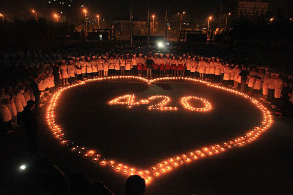 烹饪学子们将500支点亮的蜡烛摆放成一个巨大的心形,心形中是由蜡烛摆成的“4.20”字形,以哀悼在4月20日雅安强烈地震中遇难的同胞。学子们纷纷围在蜡烛外围,合掌为雅安灾民默默祈祷。默哀之后,大家喊起“四川加油”,“雅安雄起”、“重建家园”、“雅安不哭”等口号,一起为灾区人民加油祈福。