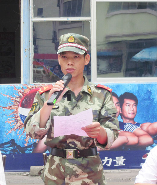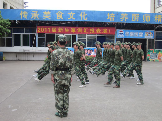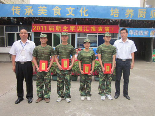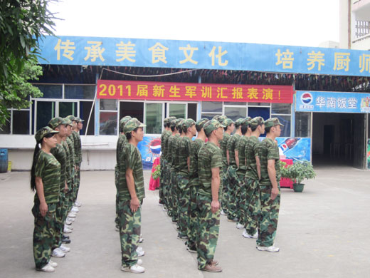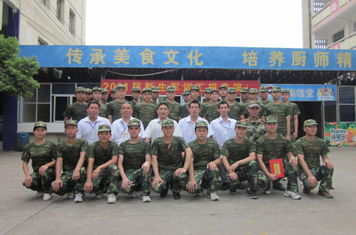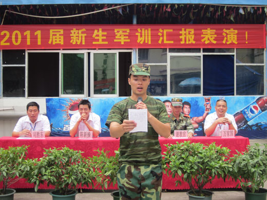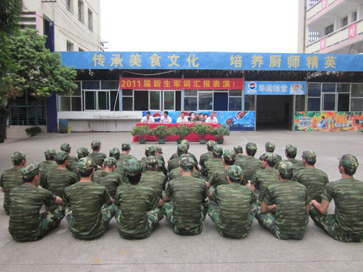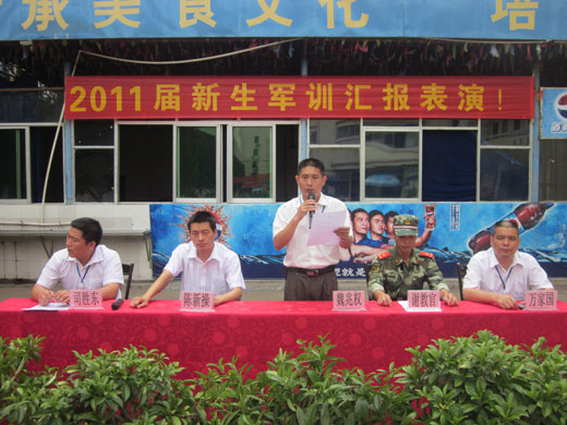 8月6日上午,我校在明秀校区隆重举行2011级大厨110(1)班学生军训汇报表演。我校领导魏兆权主任、万家国、司胜东、陈新操、等各部门负责人、带队教官和老师及大厨110(1)班全体参训学生参加了此次汇报表演大会。
