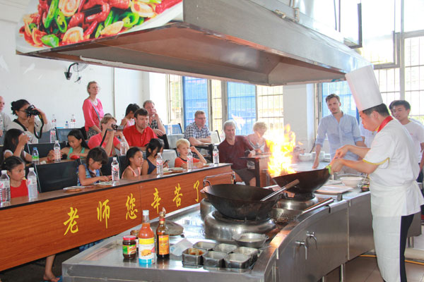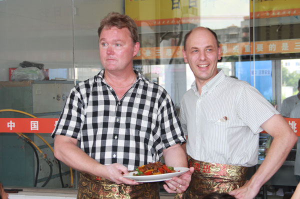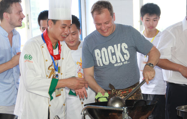 虽然语言的障碍使得在交流方面有点不方便,但也抵挡不了东方美食对瑞典朋友的吸引。为了能让外国友人亲手烹制中国菜肴,广西华南烹饪学校特别安排由老师先操作,之后在老师的指导下让外国友人亲手体验。