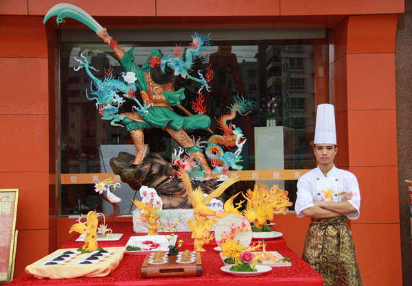平日里的黄冲身着干净的厨师装,一如既往的知性、干炼。雕刻绝技“关羽”的完美作品,不仅让全场观众见证了奇迹的一刻,同时也引来众学弟学妹的关注。面对小编的采访,黄冲向我们介绍说,“关羽泡沫雕”和所有普普通通的烹饪技能一样,始于学、精于勤,在雕刻过程中讲究“精、快、狠、准”,最简单的技能里藏着最经典的大智慧,最卓绝的技艺。