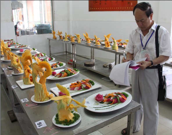 本次考核的评委有:中国烹饪协会理事、广西烹协常务理事、全国餐饮业国家一级评委、广西区烹饪协会常务副会长何逸奎、广西区鉴定中心李德枝、西园鉴定所刘桂林所长、广西华南烹饪学校创就业指导中心朱主任。