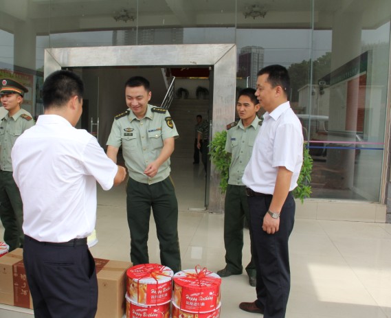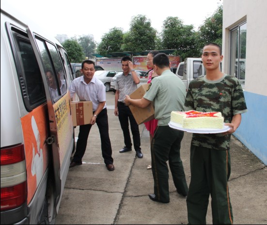 2013年7月27日上午,在“八一”建军节来临之际广西华南烹饪学校带着全体干部职工对人民子弟兵的深情厚谊和崇高敬意,为广大消防官兵送去了节日的问候和祝福,并送上慰问品。祝全体消防官兵“八一”建军节快乐。