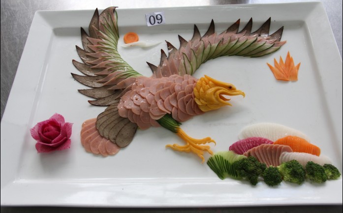 而那翻滚在水里鱼化龙,舞动着身姿,似要腾空跃起而去。想要一飞冲天的鱼化龙,身高数尺,给人一种遐想。谁也不会想到这栩栩如生的鱼化龙,竟然是一件巨大的雕刻作品。若不是亲眼所见,谁也不会相信造物者之神奇,而完成包括巨型雕刻在内的作品的,不是别人,正是广西华南烹饪学校莘莘学子们。学生们用精湛的技艺,惟妙惟肖的把作品雕刻而出。