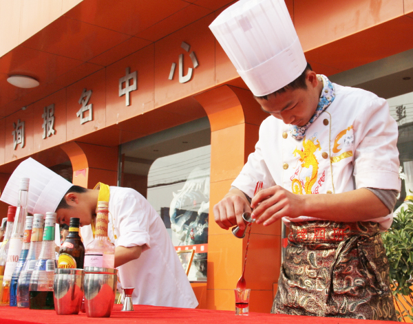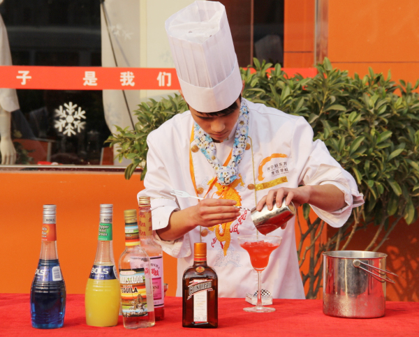 同学们台上挥舞着身姿,他们的动作娴熟,一只普普通通的酒瓶在他们手中变成了乐曲指挥棒,浮尘着,波荡着,有力的演奏着。音乐中,学生们同时调酒,只见他们拿着几种酒,确定好配料比例,开始注入调酒杯,有的原料需要轻缓注入调酒杯,有的需要用力摇晃,不同的材料在手中原来功效不同。