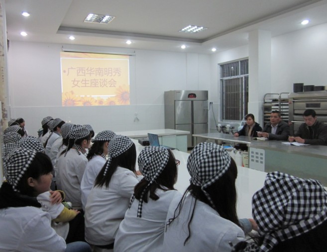 2月20日下午,广西华南烹饪学校明秀校区西点班女生专门举行了一场别开生面的座谈会,邀请到了校区主任陈新操、校区后勤主任万家国、及教师代表参加了座谈会。会议由何老师主持,座谈会本着为女生解决困难和提供帮助为初衷,期望同学们把握好在校学习好时光,努力学习为今后的人生打下良好的基础。