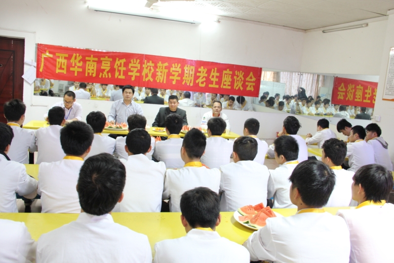 座谈会上,蓝大师首先致辞,他希望同学们在这个学期能够继续发挥上个学期的学习精神,营造一种积极健康的学习氛围。同时,蓝大师还和同学们分享了自己当年学厨师的经历和经验,听完蓝大师的讲话同学们很受鼓舞,多媒体教室里响起了阵阵掌声。