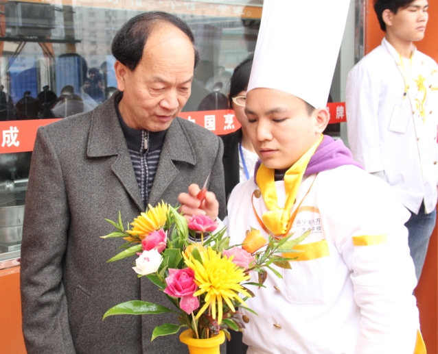 广西烹饪协会常务副会长、国家高级评委何逸奎大师给华南学子点评雕刻作品