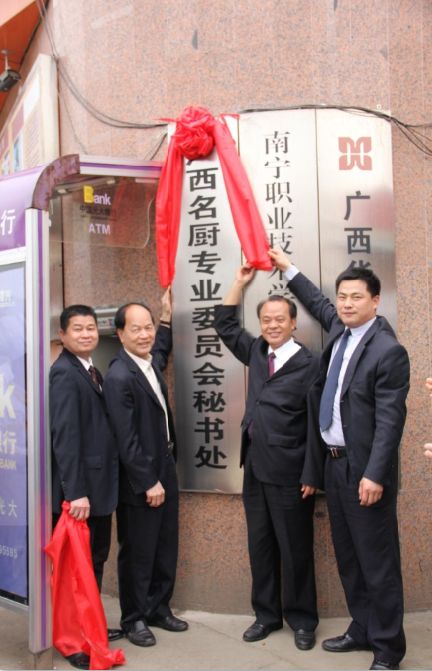 中国烹饪大师黄盛(左一),校区领导朱伟(右二)和广西烹饪餐饮行业协会会长、国家级高级评委曾大文先生(右一),广西烹饪协会常务副会长、国家高级评委何逸奎大师(左二)共同为秘书处揭牌