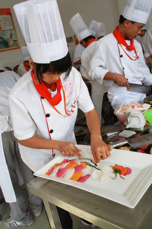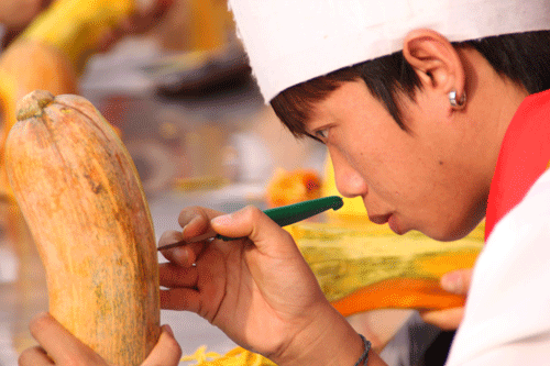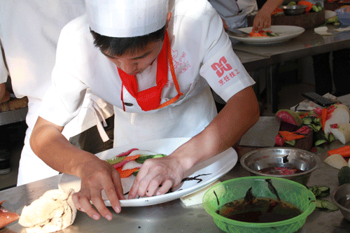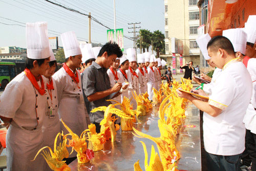 为了全面掌握和了解学员在各阶段学习情况,11月21日大厨精英111班进行雕刻和拼盘阶段的考核。这次雕刻考试要求每位学员用一个南瓜在2个小时之内雕刻一只绶带鸟。食品雕刻艺术讲究的是构图造型艺术的完整统一,要求造型构图协调、自然、和谐,组装时要注意零部件与整部件,主体与陪衬之间的比例关系。