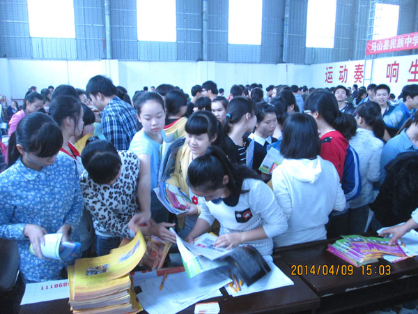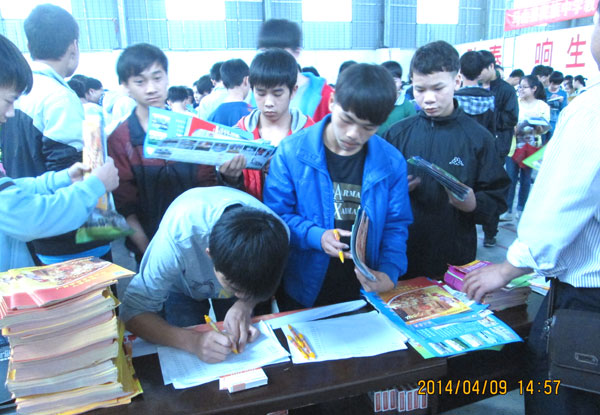 2014年4月,广西中职学校招生“大蓬车”组织50多所区内中等职业学校进行招生宣传。面对越来越强的竞争压力,中职院校期待用招生“大篷车”的形式走进初中学校进行宣传,让初中生了解中职院校。