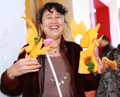 鲜、香、味俱全的五道美味菜肴做好了,市民和黄盛大师一起合影