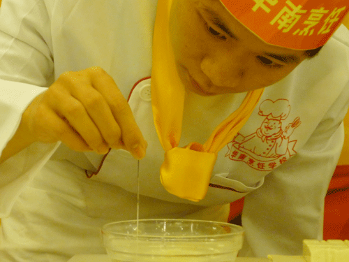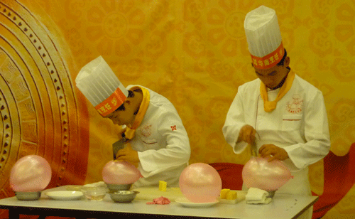 在活动现场,我校学生在大赛上精彩上演了气球上切肉丝、钉子顶气球切萝卜丝 、切豆腐穿针、蒙眼在气球上切萝卜丝等节目,吸引大批市民驻足观看和媒体的报道。活动上,我校学生表现出的高超技能和熟练的刀工,赢得了活动主办方和各领导的充分肯定和现场观众的一阵阵掌声。