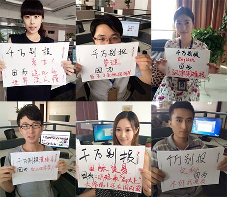 “千万别报考古,因为逗比的世界没人懂;千万别报学前教育,因为操着卖白粉的心,赚着卖白菜的钱;千万别报English,因为汉字(子)难找;千万别报环境工程,因为实习基地在垃圾处理场……”