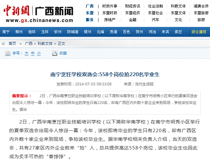 中新网广西新闻报道:7月2日,广西华南烹饪职业技能培训学校(以下简称华南学校)在南宁市明秀小区举行的夏季双选会出现令人惊讶一幕:今年,该校即将毕业的学生只有220名,却有广西区内外数十家企业来到现场,争抢该校毕业生。据华南学校相关负责人介绍,当天的双选会,共有27家区内外企业前来“抢”人,总共提供高达558个岗位,该校毕业生也因此成为炙手可热的“香饽饽”。