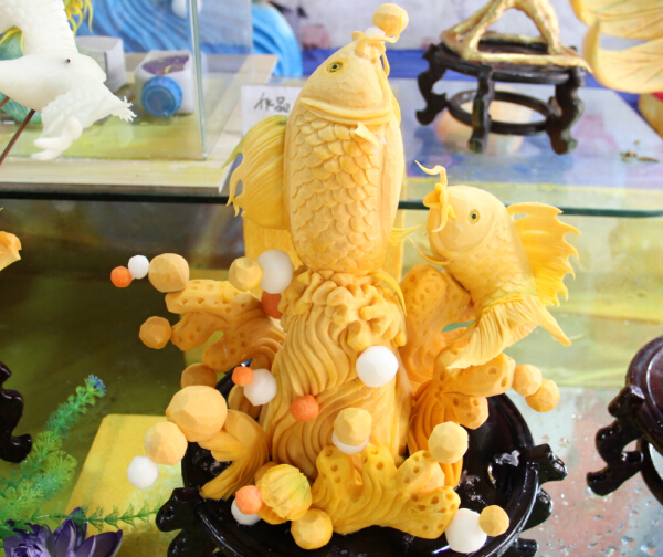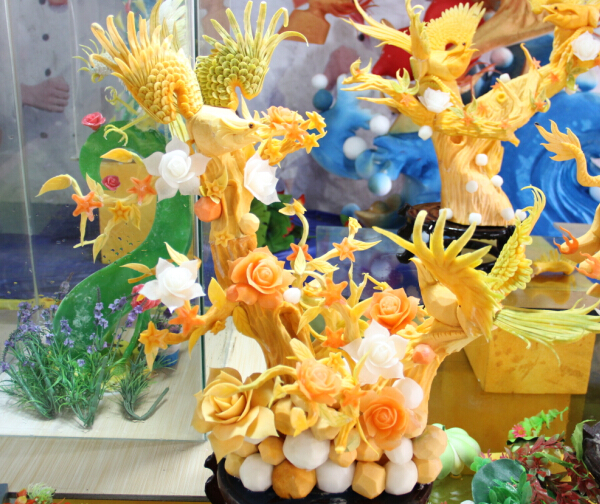 广西华南烹饪学校校园里有一个展台,每天都会吸引大量市民前去围观,有的还拿出相机进行拍摄,走进一看,原来是广西华南烹饪学校学生雕刻作品展。展台上有用南瓜雕成的雄鹰、孔雀、喜鹊、鲤鱼,萝卜雕成的百花、玫瑰,个个栩栩如生,乍一眼还以为是活物。这些雕刻更有好听的名字,这个老鹰翱翔的作品叫作雄鹰展翅,那个菊花百合争相开放的作品叫百花齐放,这个叫福星高照,那个叫寿比南山,真是一听名字就有诗情画意。