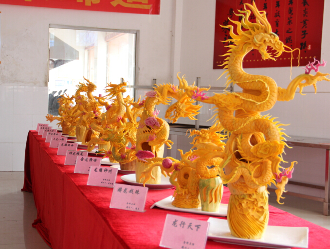 这次雕刻考试要求每位学生用南瓜在规定的时间之内雕刻一只盘旋腾飞的龙。据了解食品雕刻艺术讲研的是构图造型艺术的完整统一,要求造型构图协调、自然、和谐,组装时要注意零部件与整部件,主体与陪衬之间的比例关系。