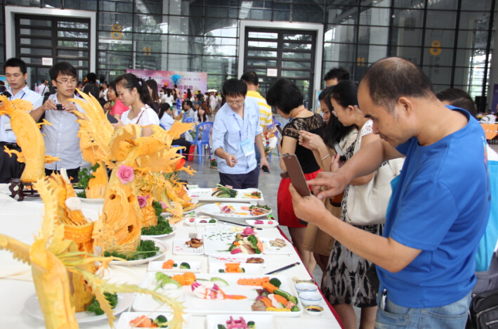 “好精美啊!”、“他们的手太巧啦!”在艺术拼盘比赛现场,精湛的拼盘技艺、惟妙惟肖作品令现场观众啧啧称赞、拍照。
