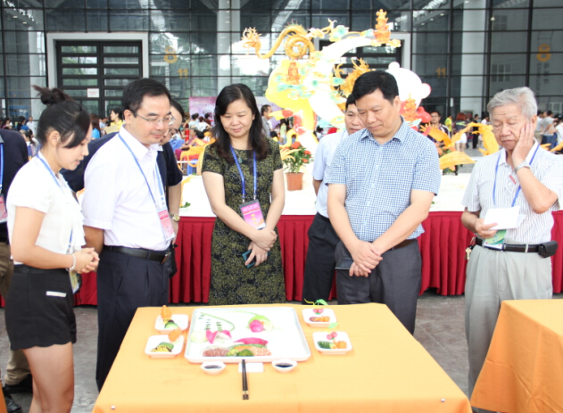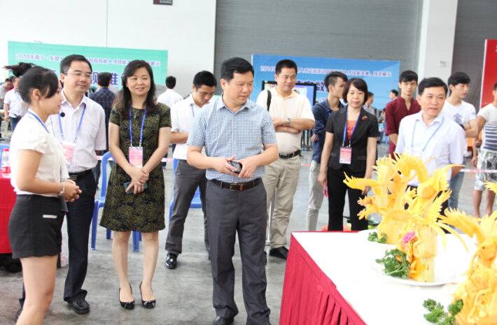 自治区领导正在食品拼盘展区进行参观!广西华南烹饪学校的参赛选手们精湛的拼盘作品得到了领导们的一致认可!