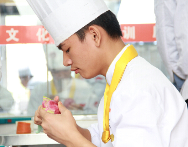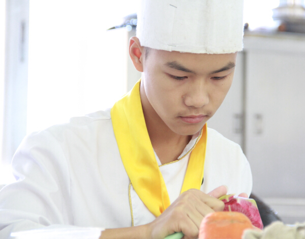 刀工作为广西华南烹饪学校基本功教学内容之一,是每一个入校学子的必学课程,也是同学们掌握烹饪技能的必备要素。此次考核要求同学们在规定的时间内把萝卜、红椒等原材料切成丝、片、块、段等不同形状,不仅要要长短一致,还需要粗细均匀,同时还要雕刻出一朵月季花。