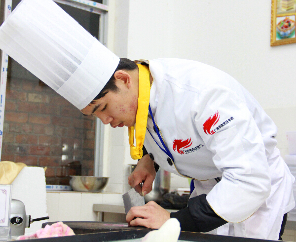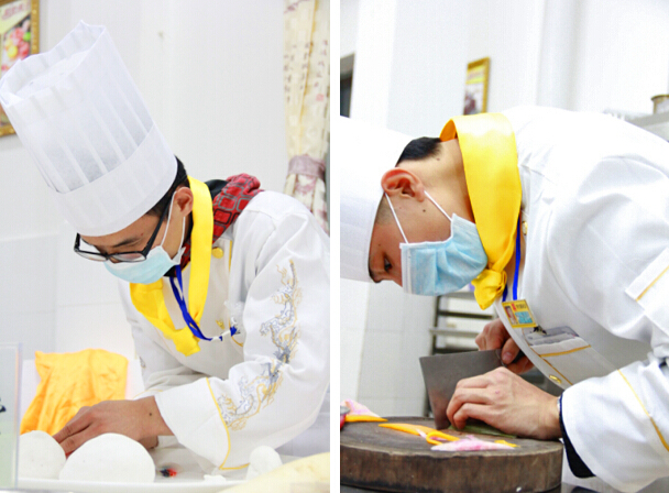 而在广西华南烹饪学校第二十届烹饪大赛冷拼组比赛场上,参赛选手正在紧张的进行着拼盘的制作。每一位参赛选手都凝眉聚神,眼观鼻,心手合一,凌厉的刀在砧板上灵活的飞舞着,奏出美妙的乐章。手腕一转,刀刃在各种食材间时而轻滑,时而勾勒,不一会儿功夫,一个个薄如蝉翼的白萝卜片、用黄瓜皮做成的金鱼等就出现在眼前。