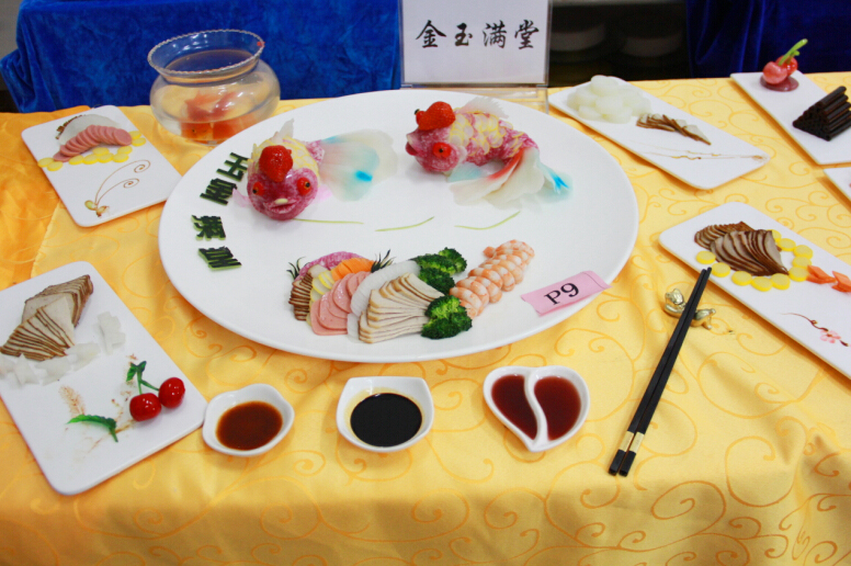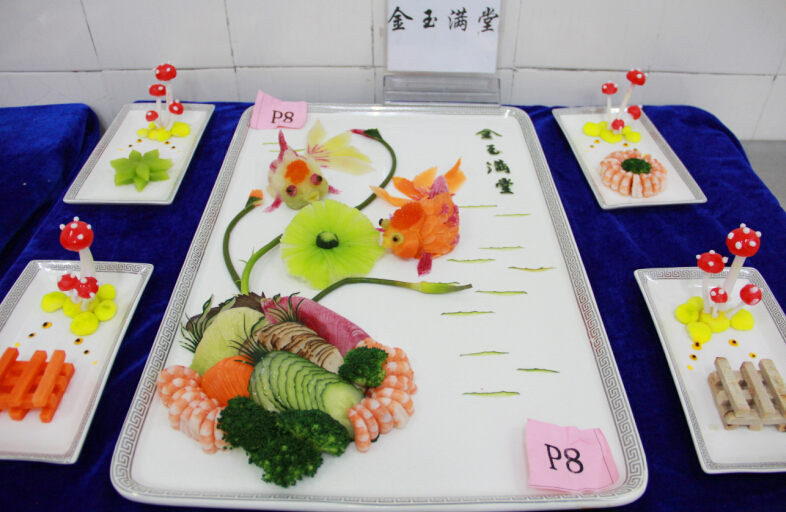 小编从评委老师处了解到,冷拼是一门非常讲究刀工、摆盘、颜色搭配和构思创意的功课。参赛选手们在赛前就开始构思参赛作品,包括选择什么样的主题,什么样的食材,食材颜色的搭配等等各方面,除了这些,在现场还要控制制作的时间。来自全校的参赛选手拿出看家本领,使出浑身解数,最后呈现出来的作品连“久经战场”的评委老师们都啧啧称赞,如《金玉满堂》中惟妙惟肖的金鱼,《锦绣中华》中闪烁的锦鸡,《大鹏展翅》中翱翔的雄鹰气势逼人,《荷韵》中优雅的荷叶,还有调皮的小蝌蚪生动形象的在荷叶下嬉戏,更有灵动的金鱼在水中嬉戏。
