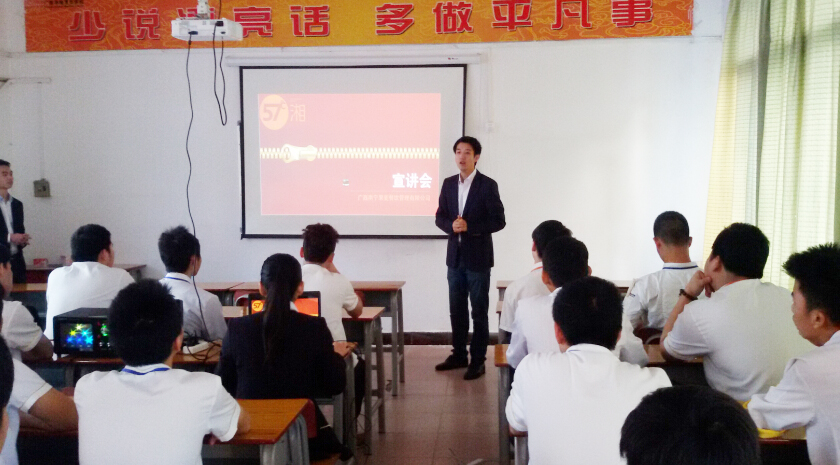 3月18日早上,在广西华南烹饪学校明秀校区多媒体教室,南宁57℃湘餐饮管理有限公司人力资源主管王总对即将毕业的学生进行招聘宣讲。