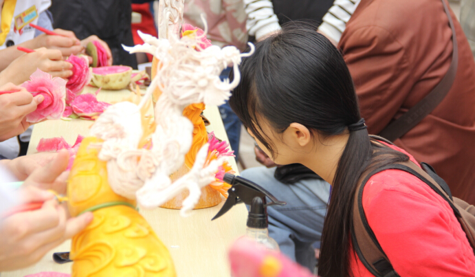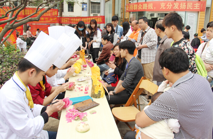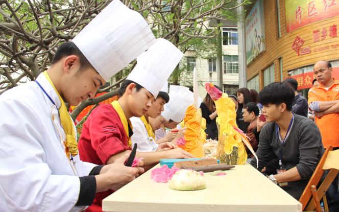本次义务活动在校学生会唐海涛老师的带领下来到了西乡塘大学东路社区广场活动现场,义务活动持续了一个早上。活动现场,我校学子现场表演精彩雕刻,耐心地为群众进行了烹饪知识宣传。看着一件件精彩绝伦、惟肖惟妙的作品,观看表演的群众响起了热烈的掌声,纷纷被我校学生精湛的雕刻技艺所折服。