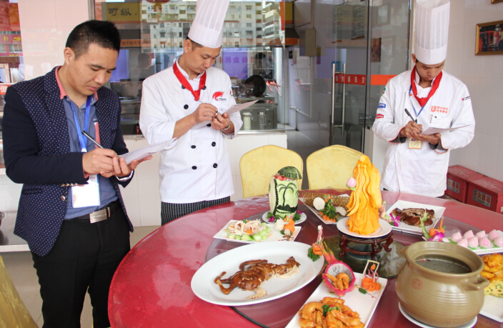 宴席制作完成以后,负责打分的老师仔细鉴别宴席上的每一道菜肴,从原料选择、颜色搭配、刀工与火候的掌握,再到整体宴席的美观度,老师们都一一给出了意见。