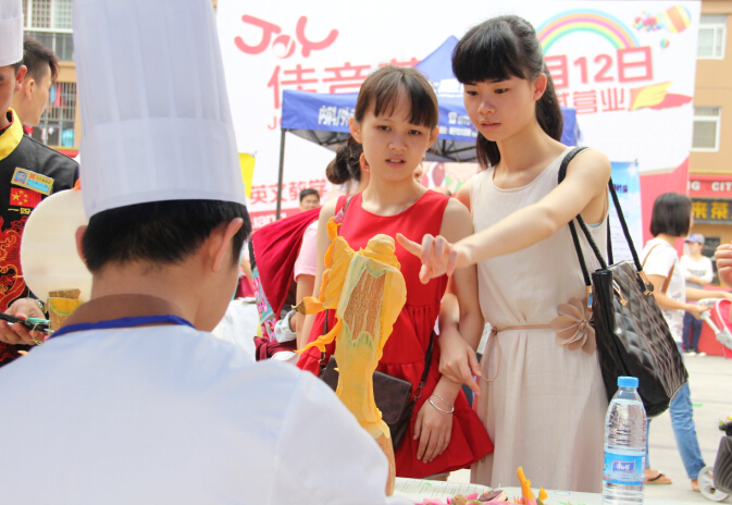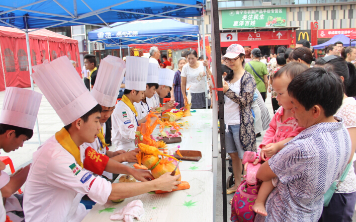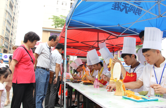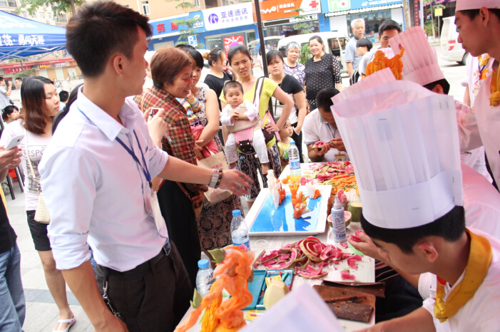 一些通过社区宣传了解到活动的居民一大早就来到华城都市广场等候广西华南烹饪学校、南宁百美汇美容美发学校的青年志愿者为他们表演食品雕刻、修剪头发。我校精彩的雕刻表演吸引着小朋友的目光,当惟妙惟肖的雕刻作品完成时得到了人们的啧啧称赞。在表演的同时同学们还耐心的对每位居民讲解烹饪的营养知识,现场分享雕刻的技巧及生活中的养生知识。广场上处处充满着青春盎然、爱心满满的志愿者义工和市民群众。