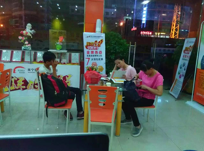 在广西华南烹饪学校的咨询中心前来咨询报名的学生络绎不绝,很多学生和家长来到这里,咨询报名学厨师,打算用实用技术武装自己。校园内汇集来自五湖四海的同学和家长,他们参观校园、选择专业、咨询报名。面对熙熙攘攘前来报名学习的学生,咨询老师们针对他们关心的专业、住宿、生活、学费等问题,有序地接待并耐心解答。这种情况常常持续到深夜。
