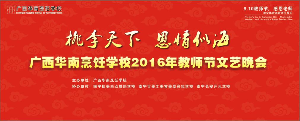 只想说一句:“老师,一定要幸福健康!”为庆祝第32个教师节到来,将于9月9日晚8:00,在中尧校区操场隆重举办广西华南烹饪学校教师节晚会,欢迎广大同学到现场观看。感恩师德,共谱华章。