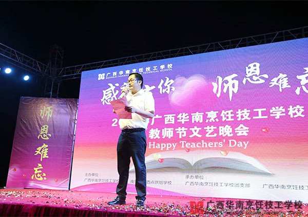 2017年9月8日晚上7点30分,以“感恩有你•师恩难忘”为主题的2017年广西华南烹饪技工学校教师节文艺晚会在中尧校区足球场举行。