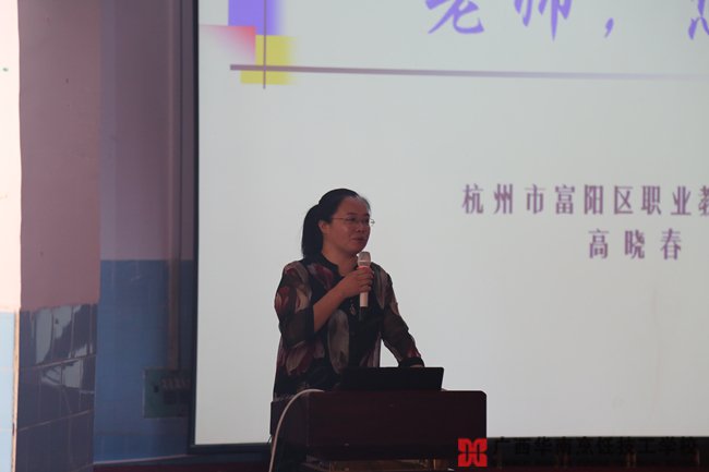 高晓春的讲座题为《做一个幸福的中职班主任》。他跟大家分享了如何做一名好的班主任,接着,她对幸福进行了阐释,高老师用多个自身例子说明老师对学生的影响。