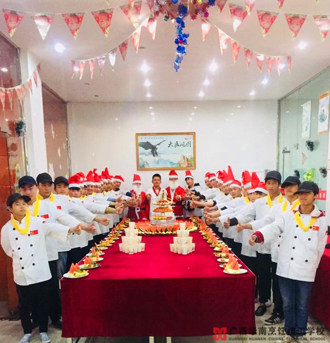 圣诞节虽然作为西方的节日,但是为了表达对来自四面八方同学们的祝福,广西华南烹饪技工学校也在圣诞节当天举行了欢乐会的活动,作为烹饪学校的一员,同学们分工有序,秩序井然,不一会儿的功夫,一桌丰盛的美味就出现在眼前。