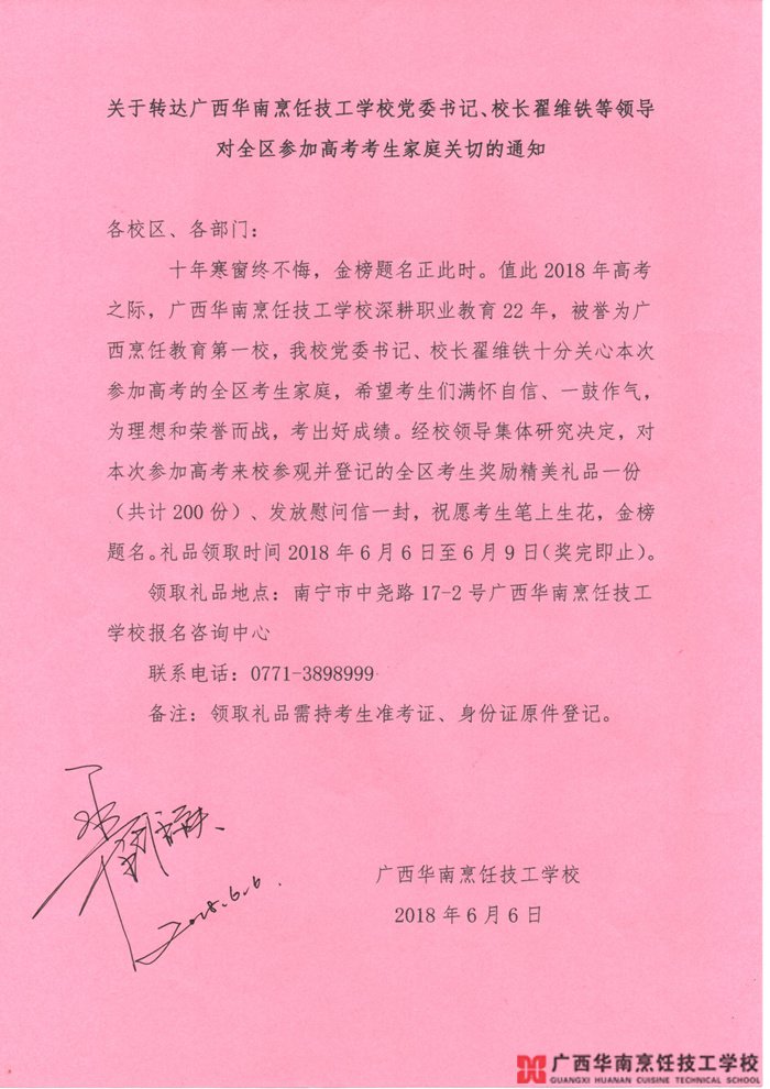 十年寒窗终不悔,金榜题名正此时。值此2018年高考之际,广西华南烹饪技工学校深耕职业教育22年,被誉为广西烹饪教育第一校,我校党委书记、校长翟维铁十分关心本次参加高考的全区考生家庭,希望考生们满怀自信、一鼓作气,为理想和荣誉而战,考出好成绩。经校领导集体研究决定,对本次来校参观、登记的高考生奖励精美礼品一份(共计200份)、发放慰问信一封,祝愿考生笔上生花,金榜题名。礼品领取时间2018年6月6日至6月9日(赠、奖完为止)。