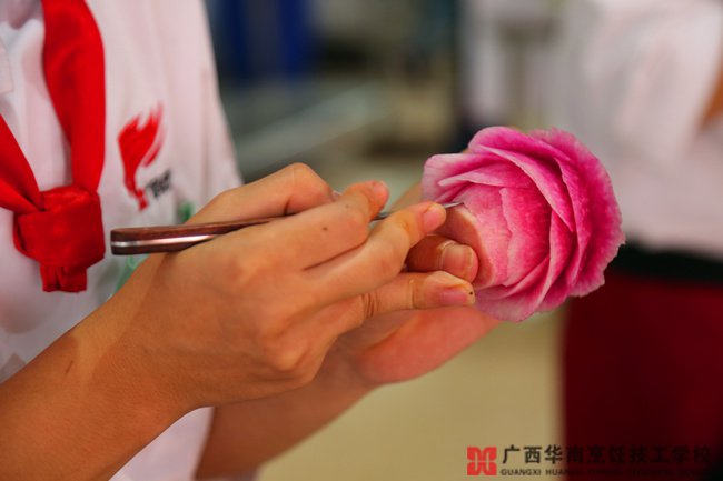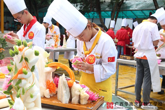8月17日上午,在广西华南烹饪技工学校的操场上,一场别开生面的技能比赛正火热进行中,那就是极具观赏的雕刻比赛。今天又是七夕,“花”理所应当成为了今天比赛的主题。