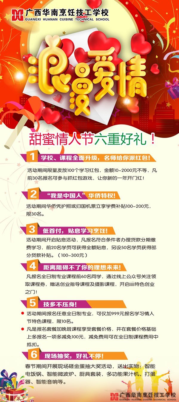 如此罗曼蒂克的日子,你想好怎么跟你的那个TA度过、怎么撒狗粮了吗?还没想好没关系,广西华南烹饪技工学校已经帮你想好啦!