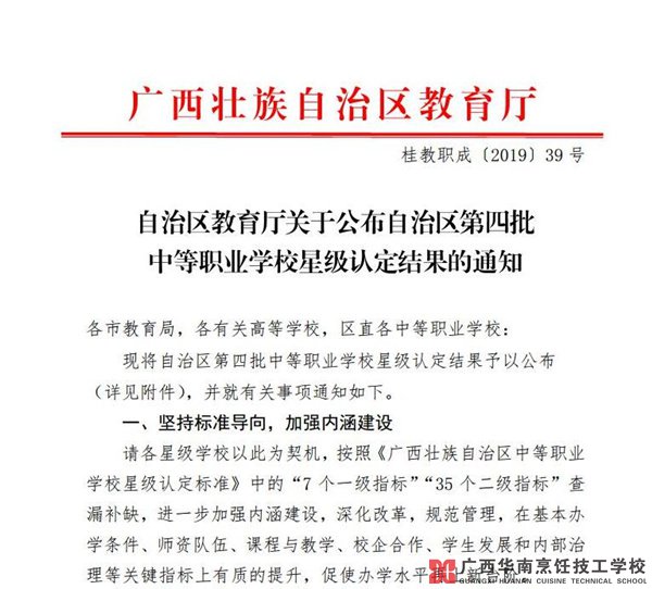 近日,自治区教育厅公布了第四批中等职业学校星级认定结果,我校榜上有名。