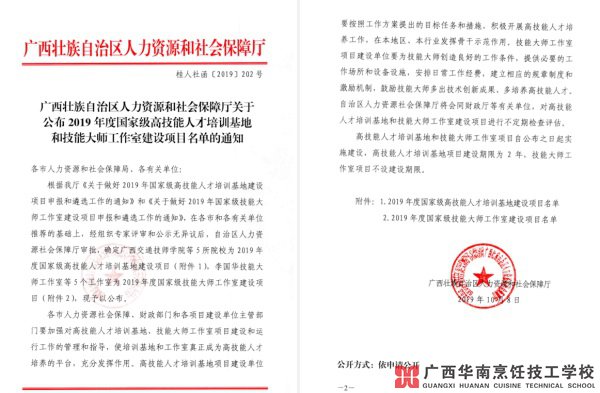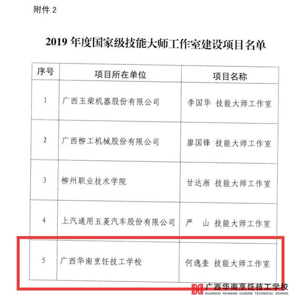 为大力弘扬工匠精神,充分发挥高技能领军人才在带徒传技、技能攻关、技艺传承、技能推广等方面的重要作用。根据人社厅《关于做好2019年国家级技能大师工作室建设项目申报和遴选工作的通知》精神要求,人社厅组织专家,对我区申报2019年国家级技能大师工作室建设项目的申报材料进行了评估审核,综合专家评审结果,评选我区2019年国家级技能大师工作室建设项目单位。我校申报的国家级技能大师工作室建设项目成功入选广西壮族自治区2019年国家级技能大师工作室建设项目。