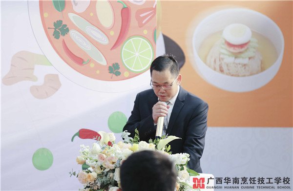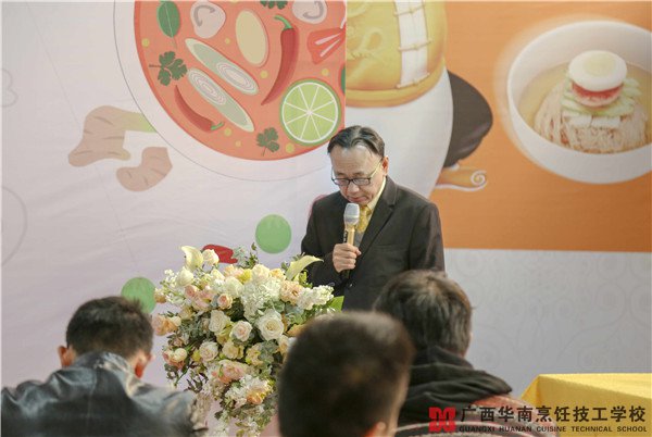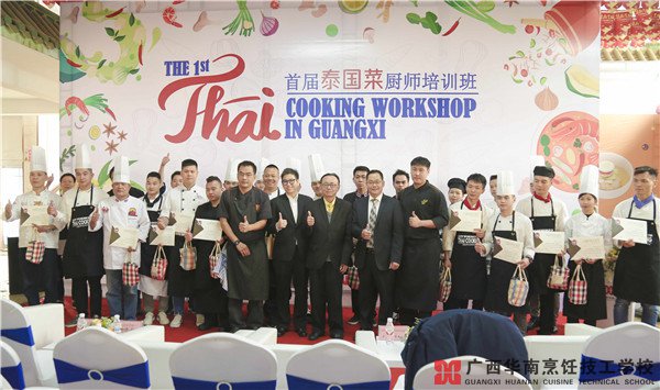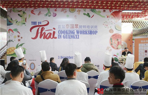 2019年12月3日,由泰王国总领事馆主办,广西华南烹饪技工学校承办的2019南宁首届泰国菜厨师培训班在我校中尧校区顺利开班。泰王国驻罗马尼亚大使蔡乐·蓬蒂窝拉卫,商务处领事万达·拉塔纳帕尼,我校校长赵志权,教学区主任卢鸬等领导嘉宾出席开班仪式。