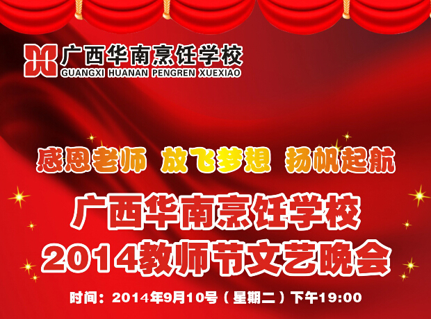 9月10日在这秋风瑟瑟的傍晚,广西华南烹饪学校第三十个教师节感恩教师、放飞梦想、扬帆起航大型晚会在明秀校区隆重举行。晚会出席的嘉宾及领导有:广西华南烹饪学校翟维铁校长,校区负责人朱伟,校区主任陈新操,校