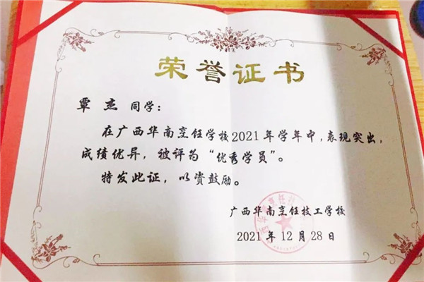 覃杰说道,非常珍惜在华南烹饪学厨的机会,不想再像初中的时候碌碌无为,浪费时光,在课余的时间也在争分夺秒地勤加练习厨艺。付出的努力时光都会证明,覃杰在校时的优秀表现让他得到了学校和老师们的认可,被评为了华南烹饪2021年度优秀学子。获得表彰的覃杰表示非常高兴,第一时间把这个好消息告诉了家人,家人也非常感动,他说这是他人生第一次为了一件事情全力以赴地去努力,最后获得了学校的认可,以前初中成绩平平的他从没有想到今天可以获得学校的优秀学子,是学校的鼓励和老师的尽心培养让他更加坚信了自己选择学厨的道路是正确的,就算是金子,也要在正确的地方才能发光发亮,让别人看见。