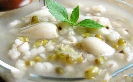 五豆汤:绿豆、赤小豆、黑豆、黄豆、白扁豆各适量,生甘草10克,煮沸后代茶饮。本汤营养丰富,既可补充盐分,又能清暑解渴,适用于男女老幼。