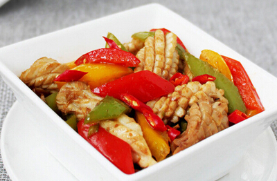 材料:鱿鱼、青椒、洋葱、红朝天椒、姜蒜、郫县豆瓣、盐、糖、料酒、鸡精