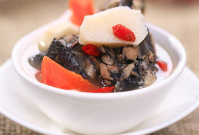 食材与做法:将乌鸡汆烫去血水后,与清水浸泡过20分钟的淮山(40克)、枸杞同置于砂锅,加料酒、姜片、热水,大火煮沸后改小火慢炖2小时左右,出锅前加盐调味。