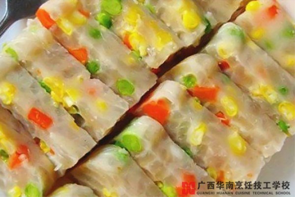 食材:猪皮500g、青豆50g、玉米粒50g、胡萝卜粒50g、浓缩宝适量、味精适量、盐适量。
